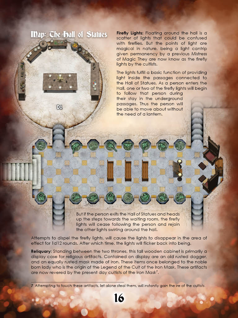 Tokens: A folder of tokens to display creatures and objects found inside the Cult of the Iron Mask, as well as Non-Player Characters (NPC’s).