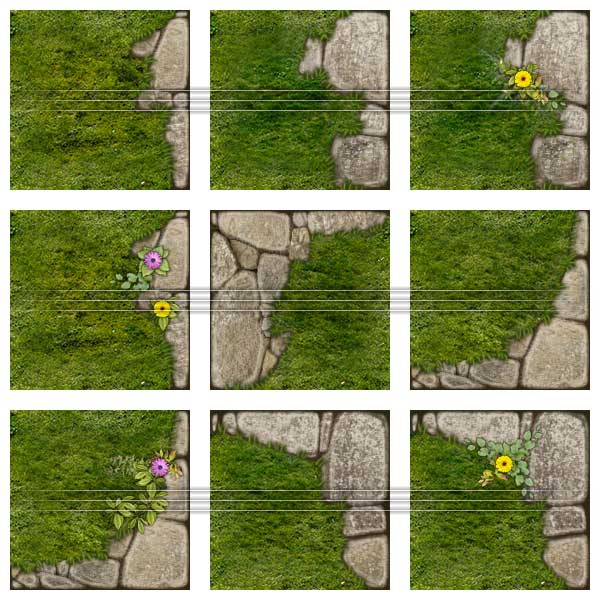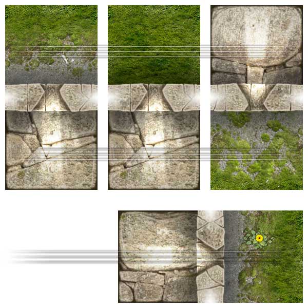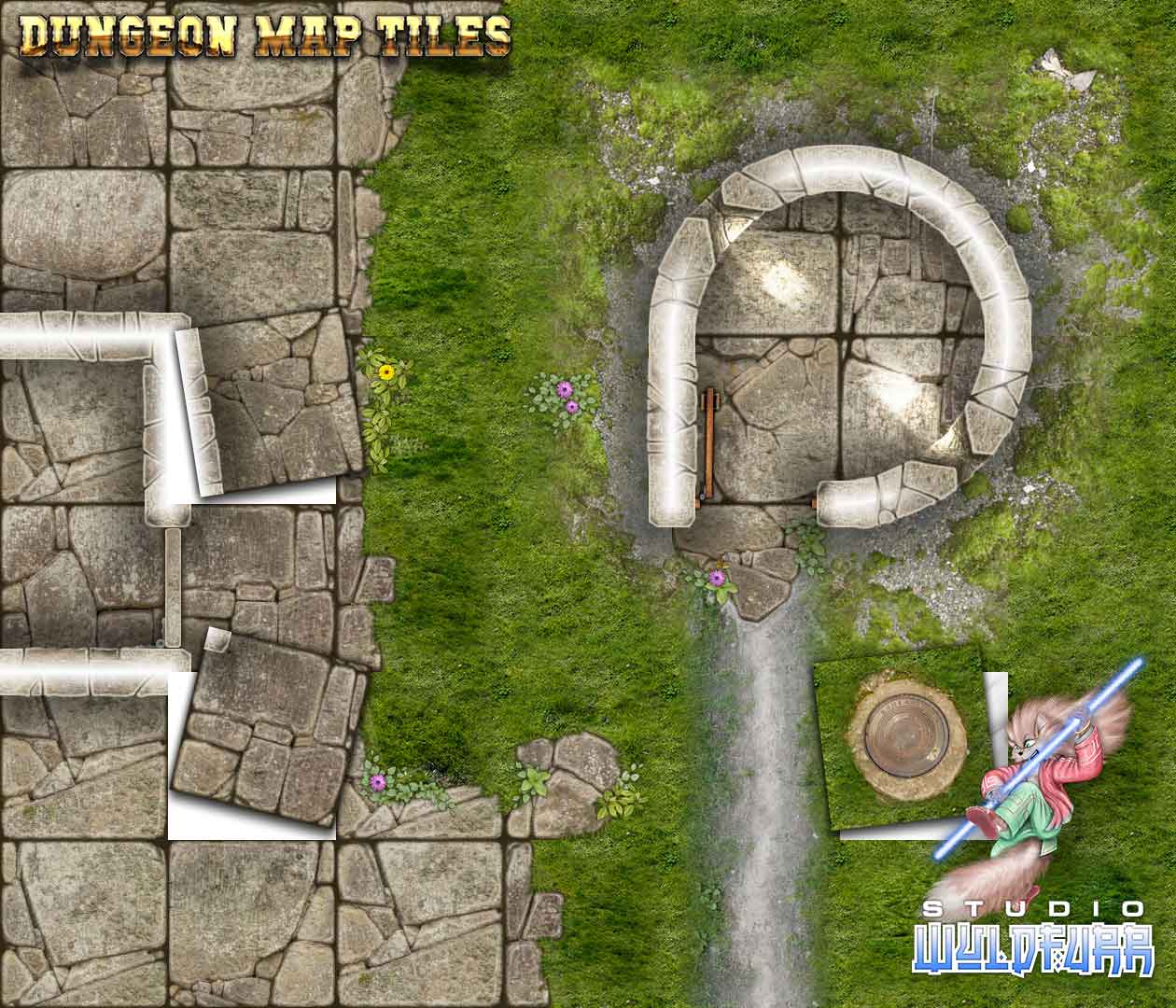 The Dungeon Map Tiles art pack is the foundation art pack of the Studio WyldFurr series of Map Tiles ready made art packs. The package contains the basic floor tiles, walls, passageways, doorways, external walls, castle walls, round tower tiles, and a range of external wilderness map tiles for grasslands, forest paths, etc. There are also flooded map tiles, split level tiles, and Special feature map tiles such as pit traps, levers, sewer grates, etc.