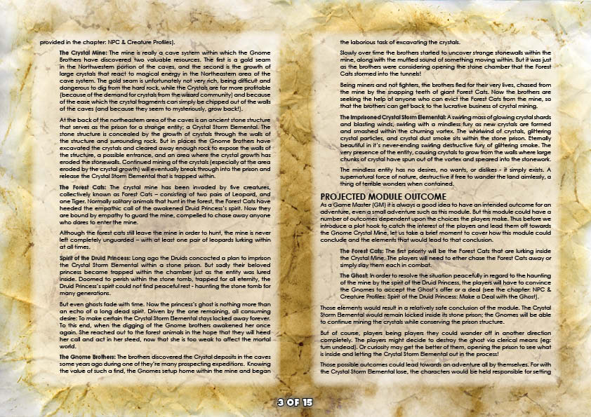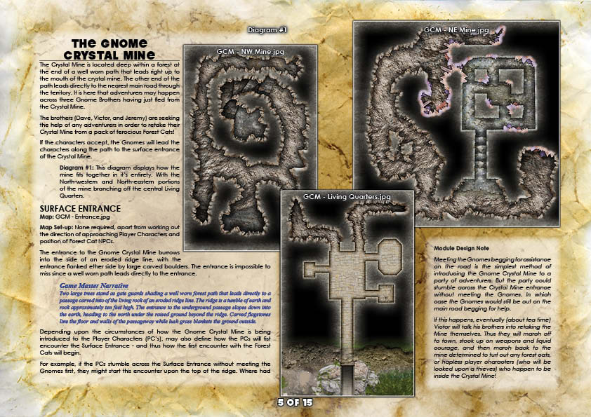 Module Guide: A PDF Module Guide. Providing Game Masters with background material about the Gnome Crystal Mine and the NPC’s associated with it. This module plot was designed with old school D’n’D in mind (d20 3.5ed or Pathfinder). But don’t let that hold you back from changing the module to fit any Role Playing Game System you use. (eg: Hack Master, or GURPS) The statistics provided are just a recommendation, nothing more.