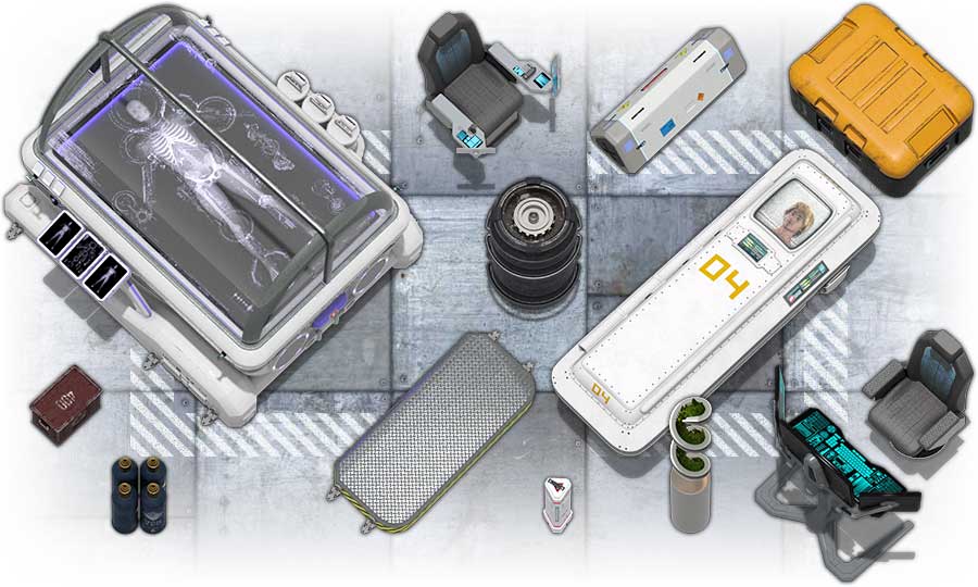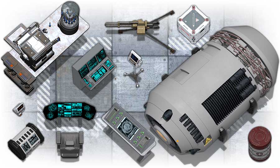 There are 89 Token Sets inside this package, with each token set depicting one object from a number of orientations. There are Computer Units, Control Panels, Holo Tables, Chairs, Tables, etc. Plus a small range of static “scatter” objects.