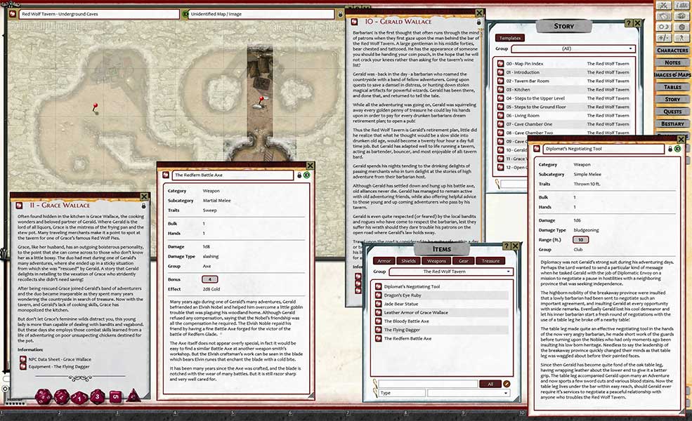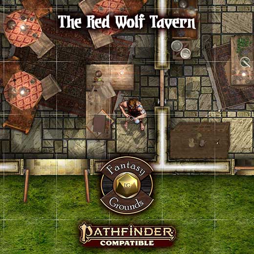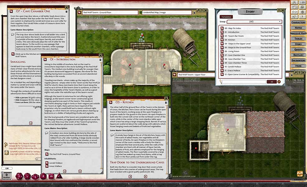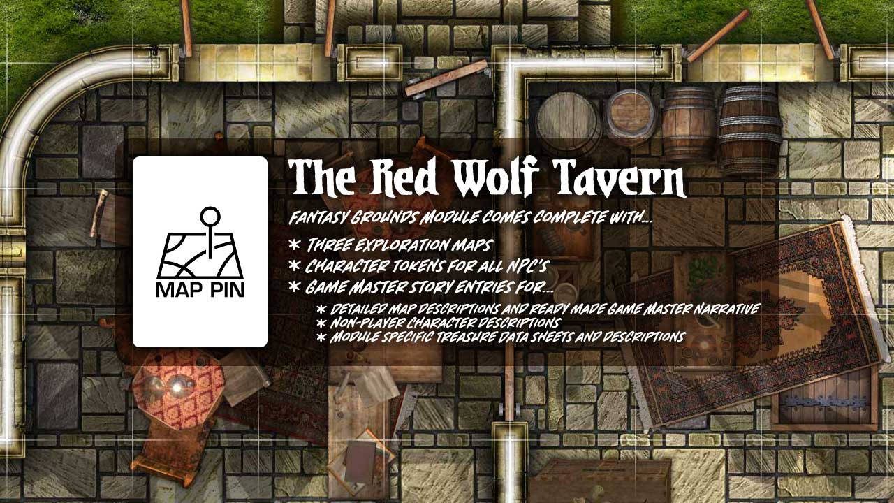 This Map Pin module contains three 2700px x 1980px adventure maps depicting the ground floor, upper floor, and the underground caves of the Red Wolf Tavern. The module includes thirteen Story Entries that detail the Red Wolf Tavern and inhabitants, along with Item Data Sheets for Special items that can be found within the tavern.