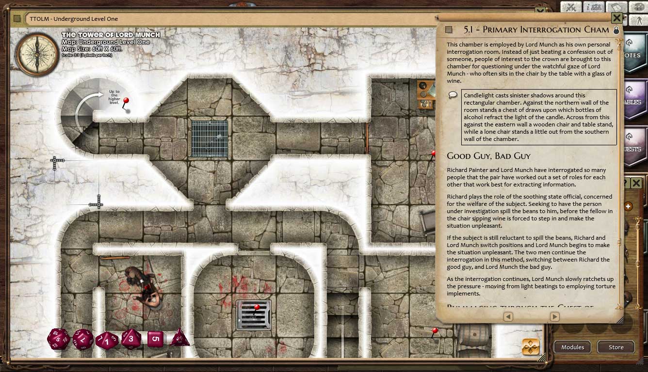 Do you role-play online using the Fantasy Grounds application to manage your virtual tabletop? The Fantasy Grounds Edition of this Compass Point (mini-adventure exploration location) contains all of the story and Game Master narrative, NPC and Object Tokens, and adventure maps contained inside a Fantasy Grounds Module. This module comes in the form of a .mod file that once unpacked from the product zip file, must be placed inside the Modules folder within the Fantasy Grounds Application Data folder. Once there the module can be activated within the Fantasy Grounds App any time you wish to use the adventure module.
